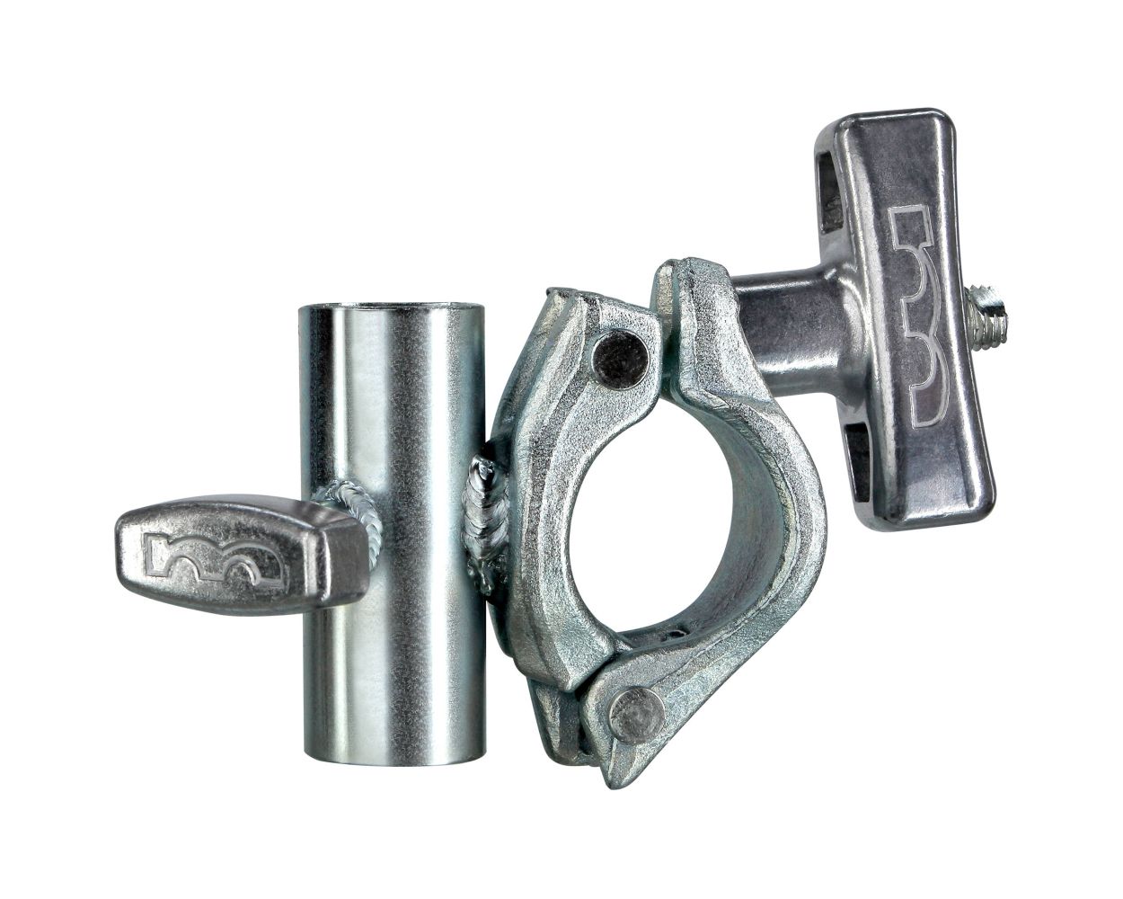 Simply clamp it around any rail or pipe (as small as 1.5" or up to 2" in outside diamter), insert the junior pin from your fixture, secure everything with a safety cable (not included, but ask us about them), and you're good to go.